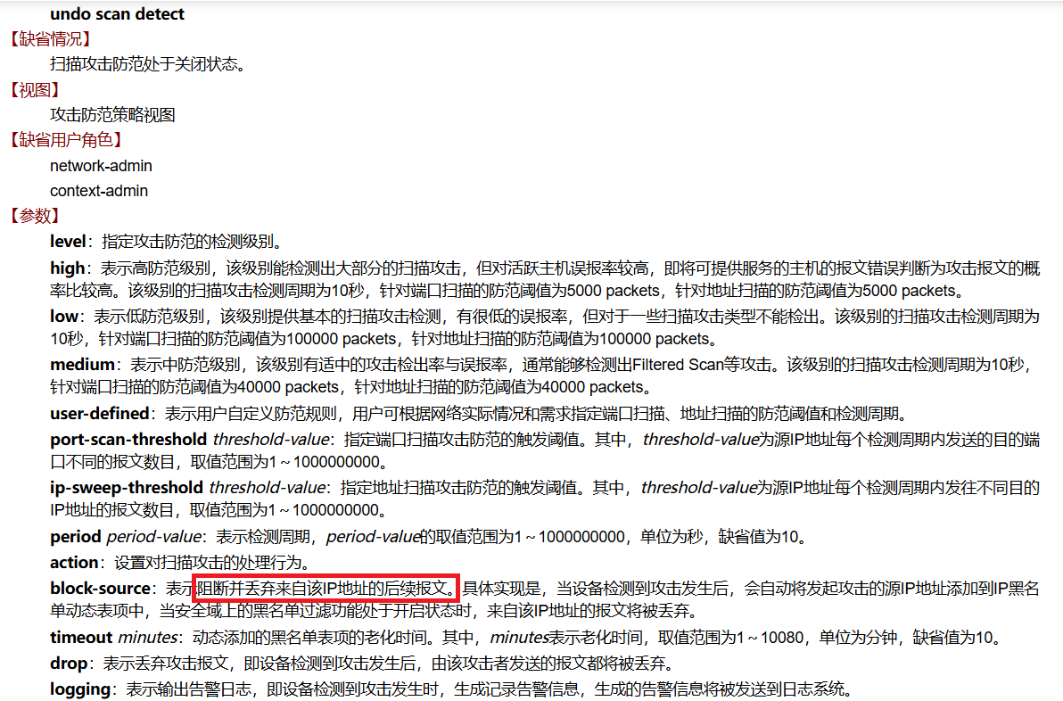 port-scan-threshold threshold-value:指定源IP每个检测周期内发送的 目的端口不同的报文数目(H3C SecPath F50X0-D命令参考)。