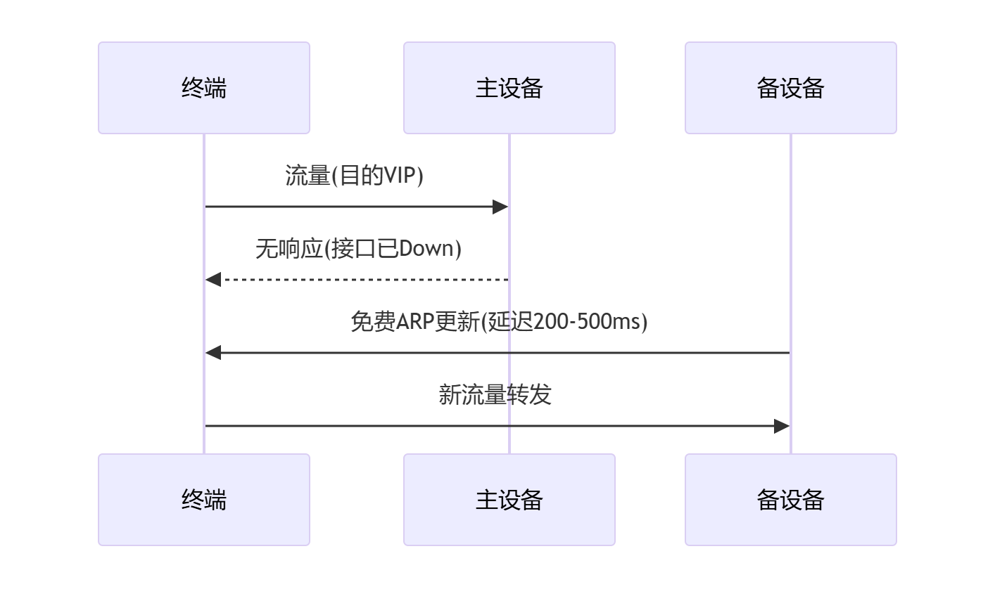 | 首次切换 | 下游设备缓存指向旧Master | 发往失效MAC | 需等待免费ARP更新 |