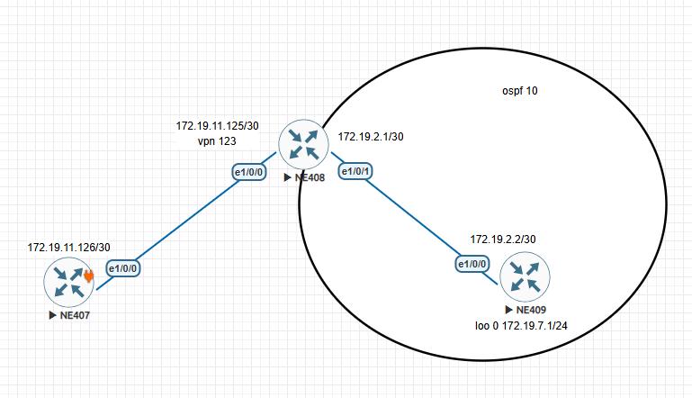 407路由信息: Route Flags: R - relay, D - download to fib, T - to vpn-instance, B - black hole route ------------------------------------------------------------------------------ Routing Table : _public_ Destinations : 8 Routes : 8 Destination/Mask Proto Pre Cost Flags NextHop Interface 0.0.0.0/0 Static 60 0 RD 172.19.11.125 Ethernet1/0/0 127.0.0.0/8 Direct 0 0 D 127.0.0.1 InLoopBack0 127.0.0.1/32 Direct 0 0 D 127.0.0.1 InLoopBack0 127.255.255.255/32 Direct 0 0 D 127.0.0.1 InLoopBack0 172.19.11.124/30 Direct 0 0 D 172.19.11.126 Ethernet1/0/0 172.19.11.126/32 Direct 0 0 D 127.0.0.1 Ethernet1/0/0 172.19.11.127/32 Direct 0 0 D 127.0.0.1 Ethernet1/0/0 255.255.255.255/32 Direct 0 0 D 127.0.0.1 InLoopBack0 408路由信息: Route Flags: R - relay, D - download to fib, T - to vpn-instance, B - black hole route ------------------------------------------------------------------------------ Routing Table : _public_ Destinations : 10 Routes : 10 Destination/Mask Proto Pre Cost Flags NextHop Interface 3.3.3.3/32 OSPF 10 1 D 172.19.2.2 Ethernet1/0/1 127.0.0.0/8 Direct 0 0 D 127.0.0.1 InLoopBack0 127.0.0.1/32 Direct 0 0 D 127.0.0.1 InLoopBack0 127.255.255.255/32 Direct 0 0 D 127.0.0.1 InLoopBack0 172.19.2.0/30 Direct 0 0 D 172.19.2.1 Ethernet1/0/1 172.19.2.1/32 Direct 0 0 D 127.0.0.1 Ethernet1/0/1 172.19.2.3/32 Direct 0 0 D 127.0.0.1 Ethernet1/0/1 172.19.7.1/32 OSPF 10 1 D 172.19.2.2 Ethernet1/0/1 172.19.11.124/30 Static 60 0 DT 0.0.0.0 123 255.255.255.255/32 Direct 0 0 D 127.0.0.1 InLoopBack0 Route Flags: R - relay, D - download to fib, T - to vpn-instance, B - black hole route ------------------------------------------------------------------------------ Routing Table : 123 Destinations : 7 Routes : 7 Destination/Mask Proto Pre Cost Flags NextHop Interface 3.3.3.3/32 OSPF 10 1 D 172.19.2.2 Ethernet1/0/1 127.0.0.0/8 Direct 0 0 D 127.0.0.1 InLoopBack0 172.19.7.1/32 OSPF 10 1 D 172.19.2.2 Ethernet1/0/1 172.19.11.124/30 Direct 0 0 D 172.19.11.125 Ethernet1/0/0 172.19.11.125/32 Direct 0 0 D 127.0.0.1 Ethernet1/0/0 172.19.11.127/32 Direct 0 0 D 127.0.0.1 Ethernet1/0/0 255.255.255.255/32 Direct 0 0 D 127.0.0.1 InLoopBack0 409路由信息: Route Flags: R - relay, D - download to fib, T - to vpn-instance, B - black hole route ------------------------------------------------------------------------------ Routing Table : _public_ Destinations : 11 Routes : 11 Destination/Mask Proto Pre Cost Flags NextHop Interface 3.3.3.3/32 Direct 0 0 D 127.0.0.1 LoopBack0 127.0.0.0/8 Direct 0 0 D 127.0.0.1 InLoopBack0 127.0.0.1/32 Direct 0 0 D 127.0.0.1 InLoopBack0 127.255.255.255/32 Direct 0 0 D 127.0.0.1 InLoopBack0 172.19.2.0/30 Direct 0 0 D 172.19.2.2 Ethernet1/0/0 172.19.2.2/32 Direct 0 0 D 127.0.0.1 Ethernet1/0/0 172.19.2.3/32 Direct 0 0 D 127.0.0.1 Ethernet1/0/0 172.19.7.0/24 Direct 0 0 D 172.19.7.1 LoopBack1 172.19.7.1/32 Direct 0 0 D 127.0.0.1 LoopBack1 172.19.7.255/32 Direct 0 0 D 127.0.0.1 LoopBack1 255.255.255.255/32 Direct 0 0 D 127.0.0.1 InLoopBack0