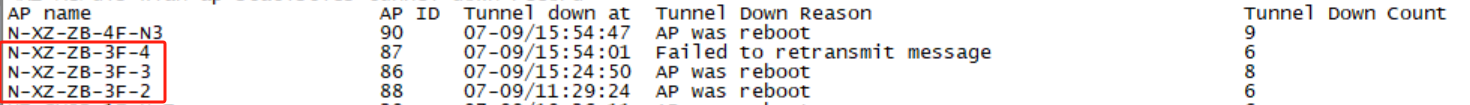 AP name AP ID Tunnel down at Tunnel Down Reason Tunnel Down Count N-XZ-ZB-4F-N3 90 07-09/15:54:47 AP was reboot 9 N-XZ-ZB-3F-4 87 07-09/15:54:01 Failed to retransmit message 6 N-XZ-ZB-3F-3 86 07-09/15:24:50 AP was reboot 8 N-XZ-ZB-3F-2 88 07-09/11:29:24 AP was reboot 6 XZ-SYJD-1F-N-Z 20 07-09/10:26:11 AP was reboot 6