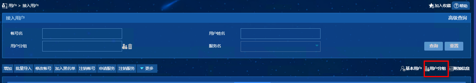 EIA的用户分组在“用户-接入用户管理-接入用户”界面的右上角。“用户分组”。