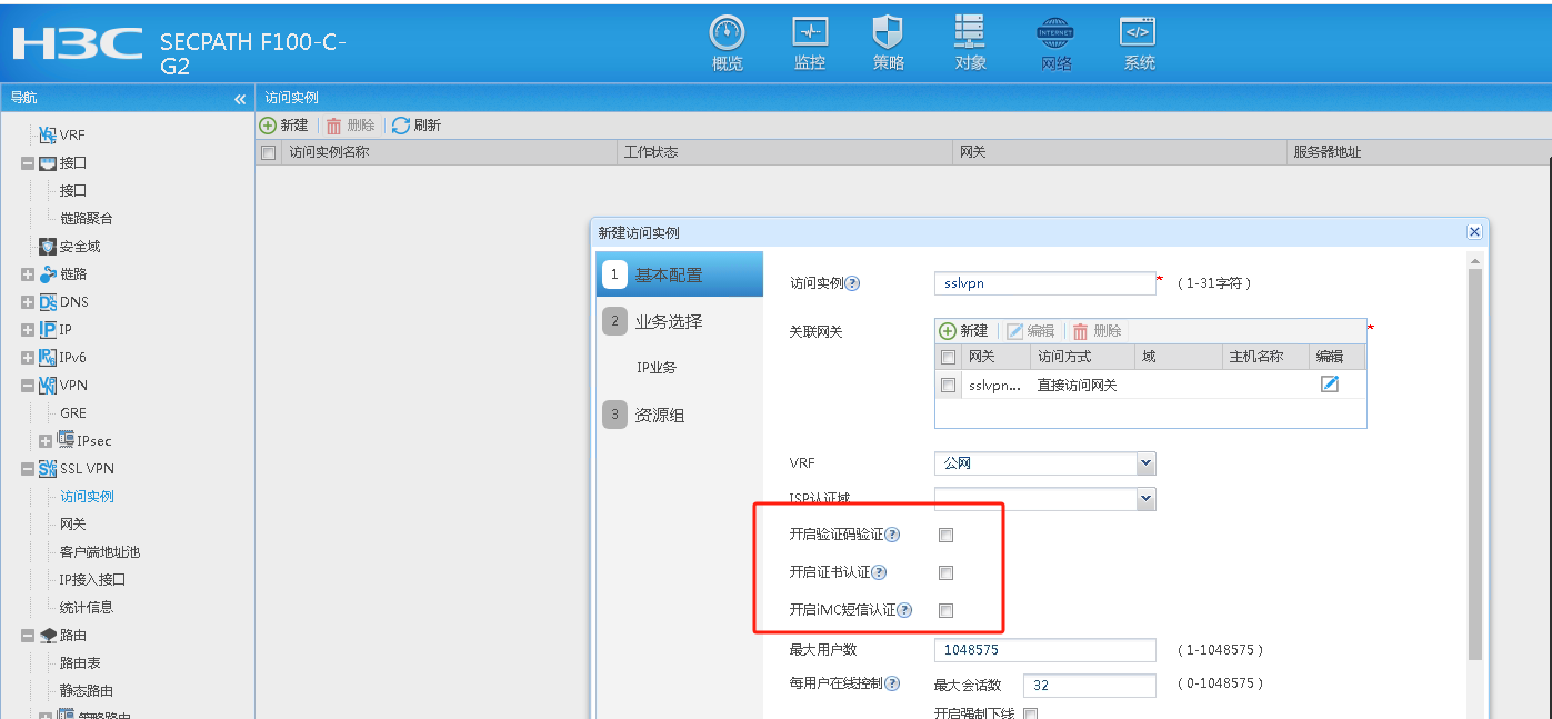 单位的h3cf100防火墙创建SSLVPN供移动办公用户使用,配置时候发现没有密码验证选项,我设备是老款设备,不知道如图这些验证选项选择哪个能实现用户密码验证方式使用VPN?