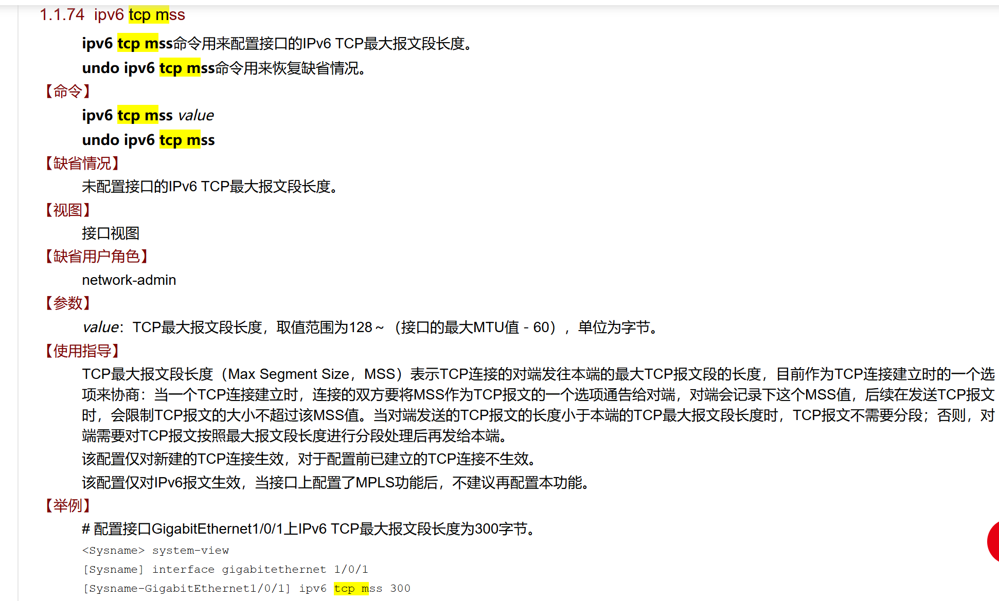 缺省情况下,未配置接口的TCP最大报文段长度。