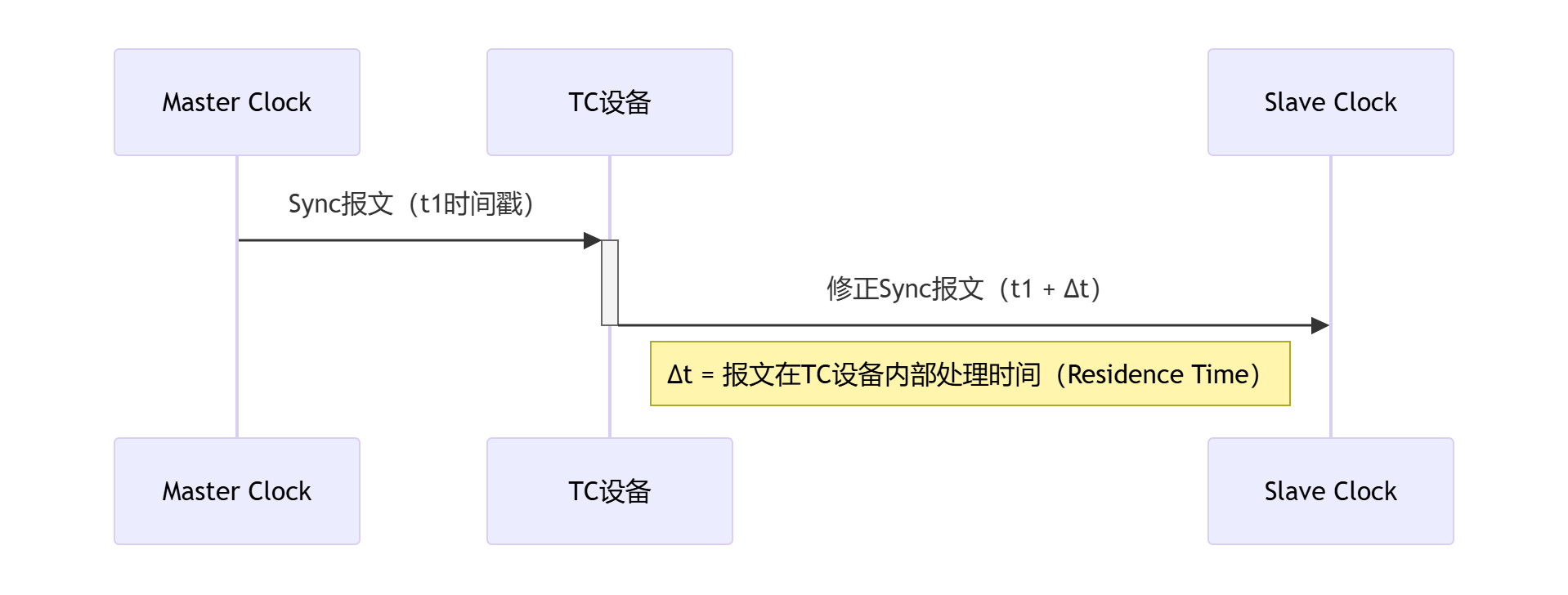 ​Residence Time修正​TC设备测量报文在设备内部处理时间(Δt),并直接修改PTP报文的​​correctionField字段​