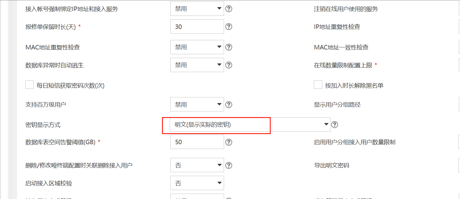 接入设备的这个密钥是吧,可以看到,在用户>接入策略管理>业务参数配置>系统配置>系统参数配置,找到【密钥显示方式】,改成明文就行