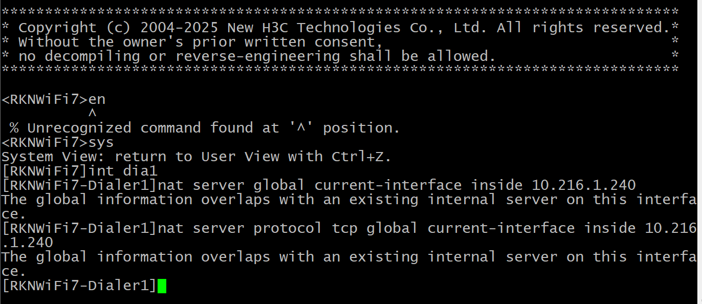 dailer端口已存在如下配置,想把内网另外一台host映射到外网,输入以下命令均提示 The global information overlaps with an existing internal server on this interface.