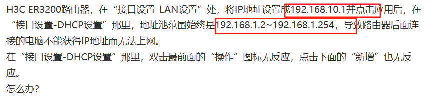 H3C ER3200路由器,在“接口设置-LAN设置”处,将IP地址设置成192.168.10.1并点击应用后,在“接口设置-DHCP设置”那里,地址池范围始终是192.168.1.2~192.168.1.254,导致路由器后面连接的电脑不能获得IP地址而无法上网。