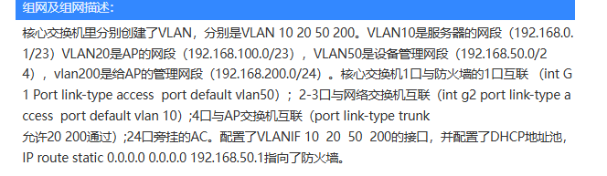 核心交换机里分别创建了VLAN,分别是VLAN 10 20 50 200。VLAN10是服务器的网段(192.168.0.1/23)VLAN20是AP的网段(192.168.100.0/23),VLAN50是设备管理网段(192.168.50.0/24),vlan200是给AP的管理网段(192.168.200.0/24)。核心交换机1口与防火墙的1口互联 (int G1 Port link-type access port default vlan50);2-3口与网络交换机互联(int g2 port link-type access port default vlan 10);4口与AP交换机互联(port link-type trunk