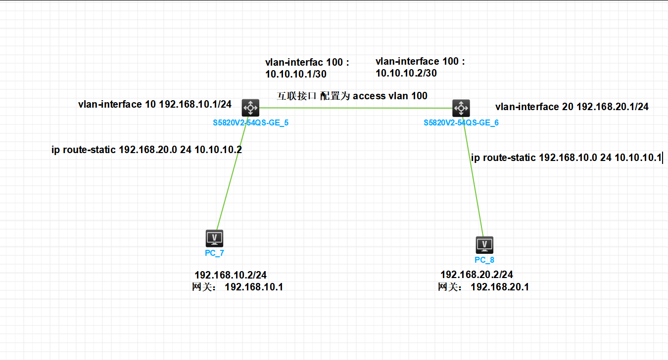 两端新建同一个vlan,给个互联地址,trunk放通,下一跳给到互联地址