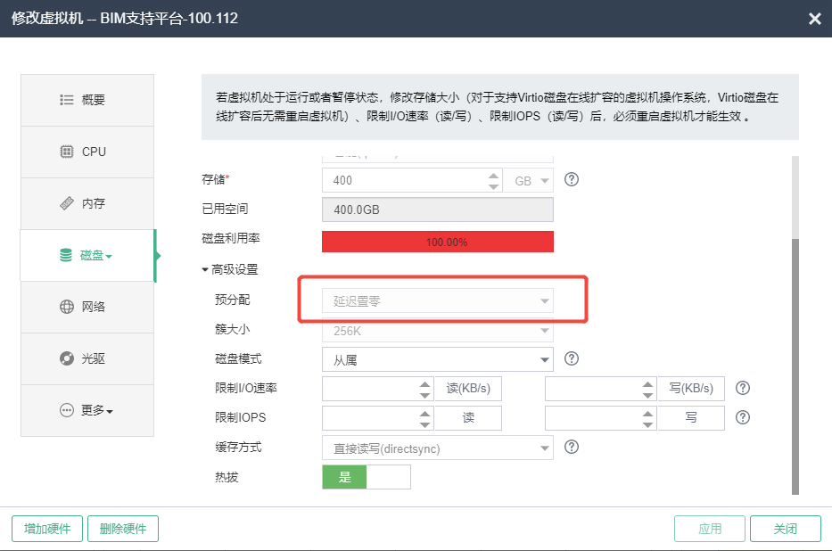 我在别外1台关闭的虚拟机上测试了一下,把磁盘模块改成精简了,可以调整大小了,但有个疑问就是虚拟机原来的预分配模式为“延迟置零”修改为“精简”后是否对虚拟机的数据有影响?这台正在运行的业务服务器数据还比较重要,所以还有点这方面的顾虑