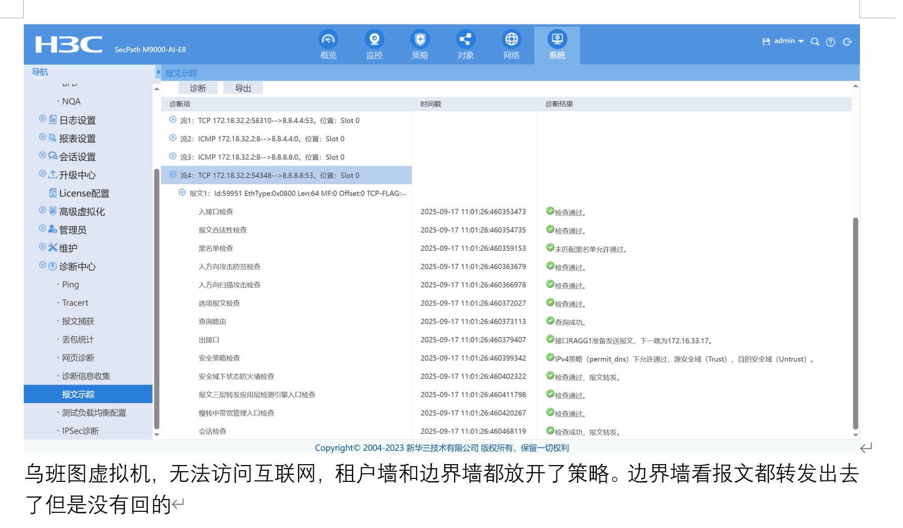 我找了这个区的另外一台虚拟机,可以通百度,报文示踪迹显示它做了NAT,我这个不通的似乎是因为没做NAT?这要在哪额外配置?