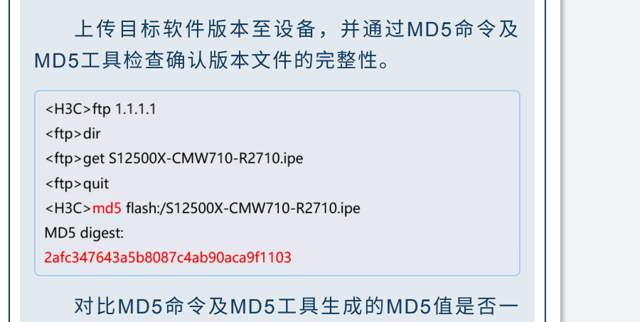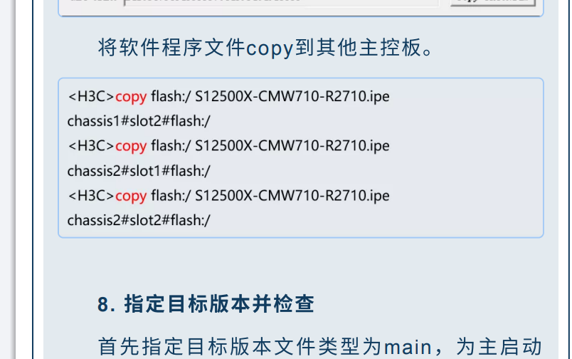 想询问下,华三设备升级按官网手册是堆叠时候直接tftp获取后,再分别copy到其他slot1板卡和slot2板卡。考虑到dir flash存储大小,那正常直接tftp到slot1里,在复制到slot2也可以的吧?我理解是上传1次后再分别复制到2个板卡,不就占了3个文件了吗,还是说堆叠的flash里也要有一个?