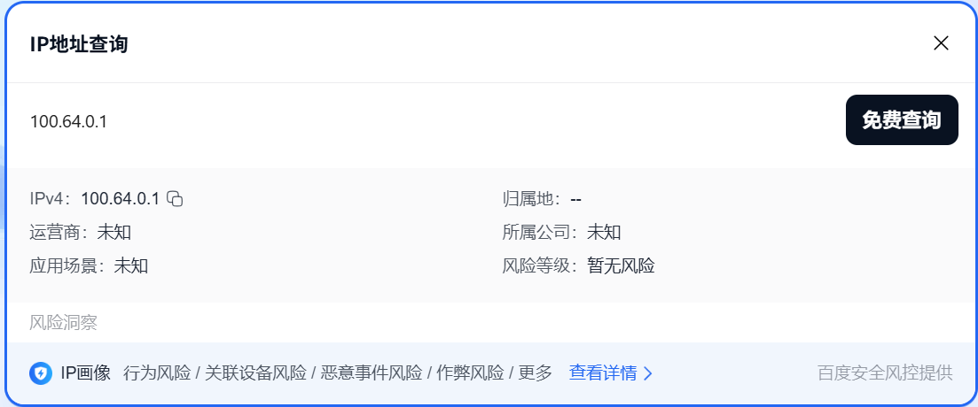 100.64.0.0/10这个网段就是用于运营商做多级NAT的,归属地都查不到。
