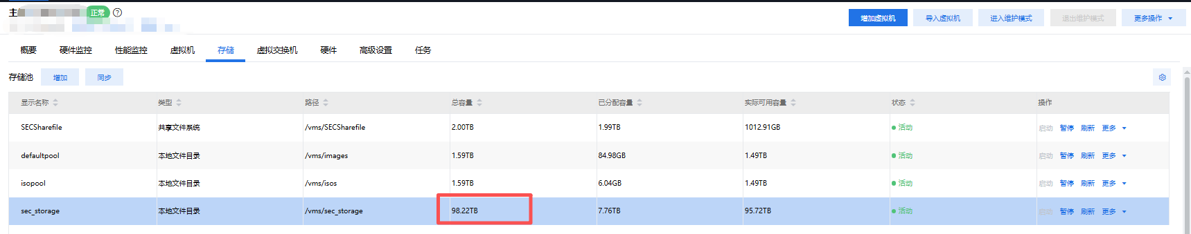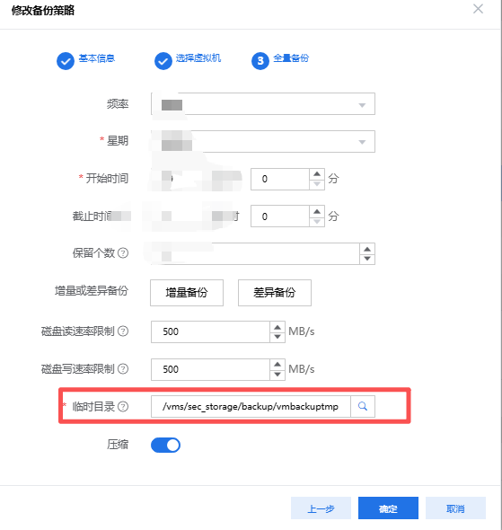 例如你1TB的磁盘使用了200GB,系统备份时仅备份了所使用的200GB。但是由于备份时cvk主机会对虚拟机使用磁盘进行压缩,压缩的数据大概是所使用数据的两倍,压缩的数据暂时存储在临时目录,临时目录会造成空间不足的问题,会导致备份失败。