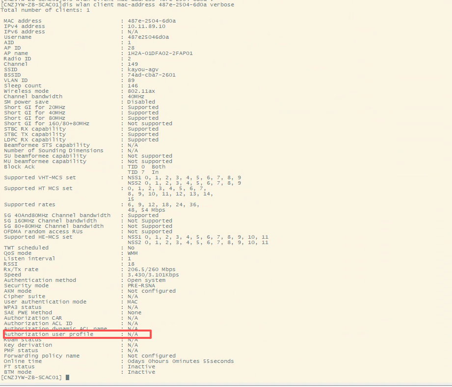 授权策略冲突user-profile中配置的wlan permit-ssid与用户实际连接的SSID不匹配时,会导致认证通过但业务授权失败(报错reason code=2094)。