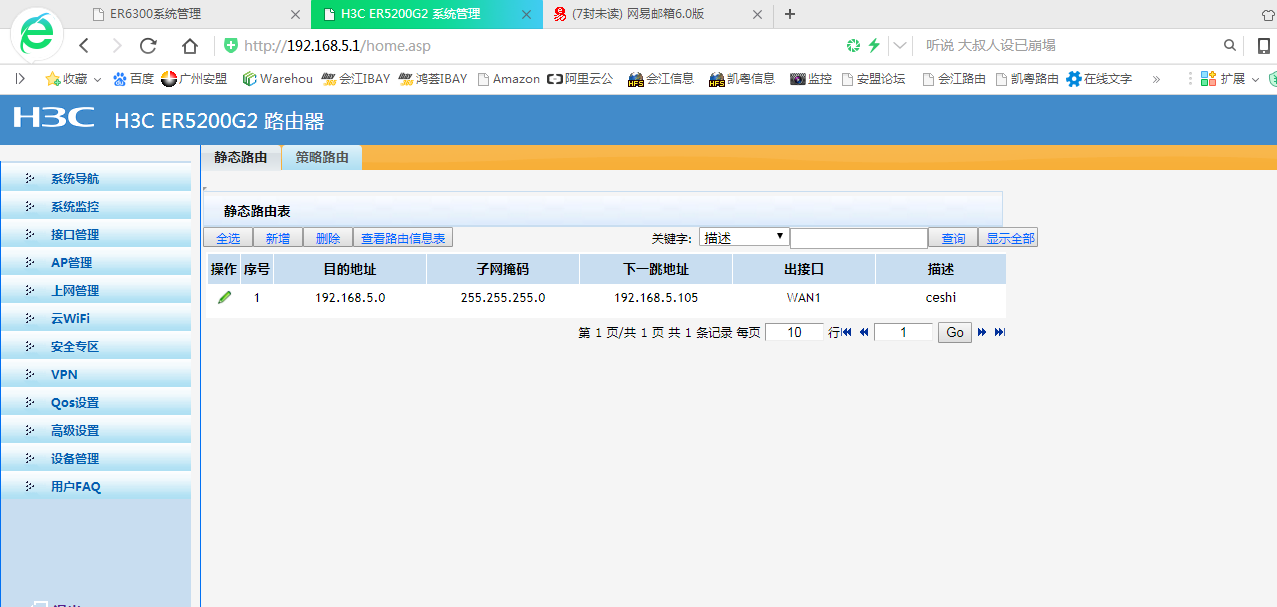 我也做了静态路由,不过不行。一款是ER6300(A路由器),一款是ER5200G2(B路由器)的。一台主机是双网卡的。其中一个网卡是IP192.168.5.104A路由器,其中一个网卡是IP192.168.5.105B路由器的。但是我6300的路由器还是配置不到静态路由的,5200的路由器可以配置LAN的,如何可以让两台路由器互访
