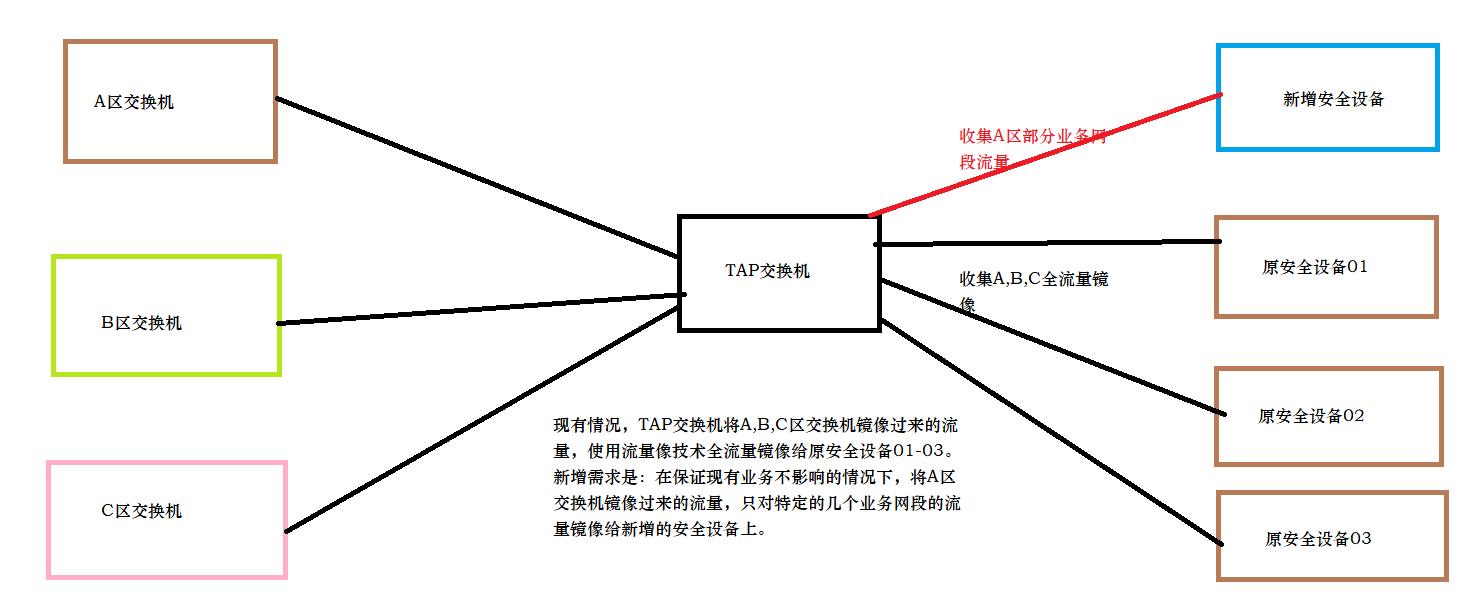 目前新增了一个需求,在源镜像过来的三个区中(A,B,C),在A区镜像过来的流量,针对部分特定的网段的业务做流量镜像,并将该流量镜像给新增的安全设备上。同时要保留现有的全流量镜像的业务。