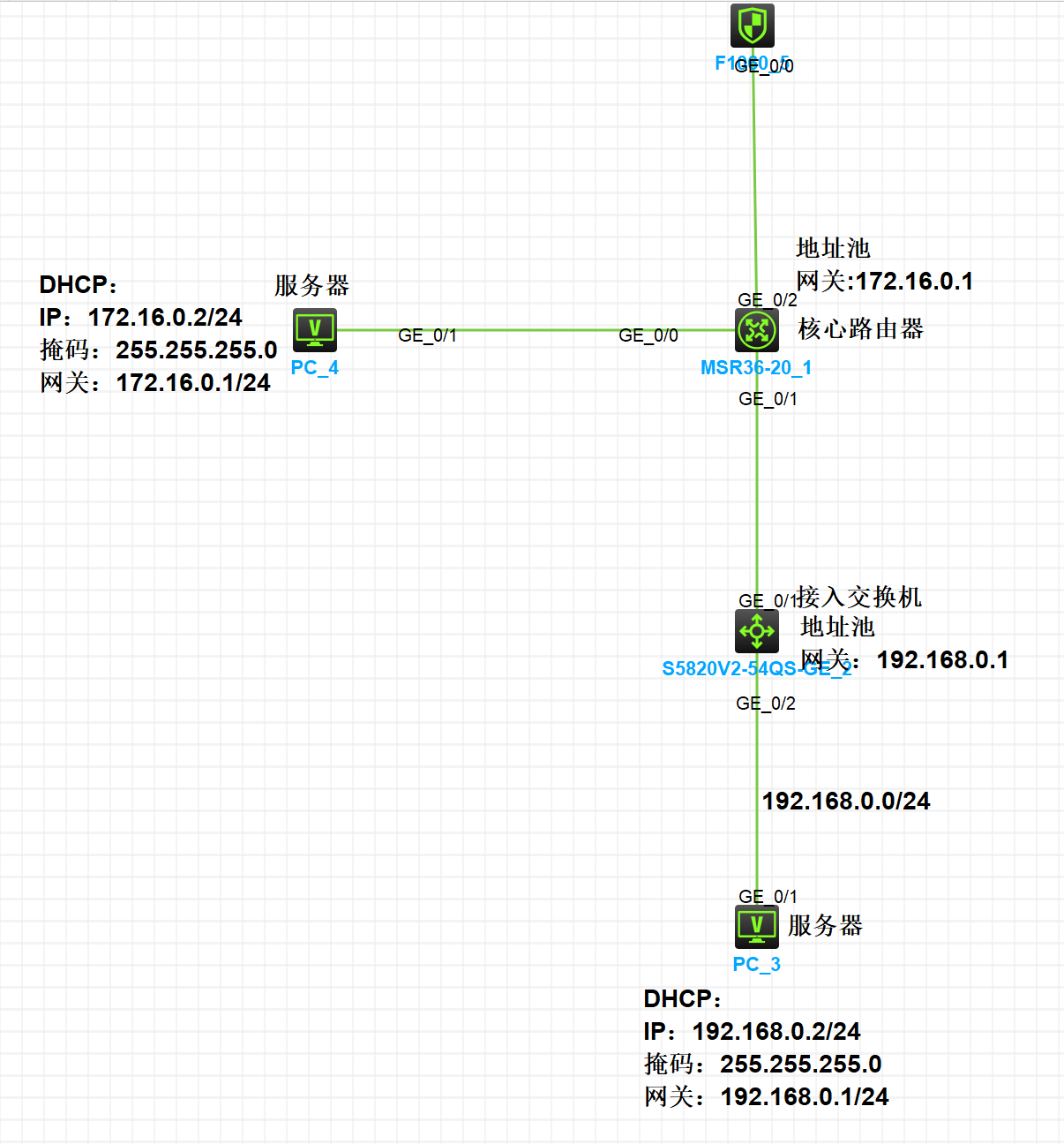172.16.0.0/24,网关仍为核心路由器GE_0/0接口(172.16.0.1),服务器PC_4在此网段。192.168.0.0/24,网关下沉到接入交换机S5820V2-54QS-GE_2的GE_0/1接口(192.168.0.1),服务器PC_3在此网段。GE_0/2接口需配置172.16.0.1(维持原网段网关),GE_0/1接口需配置192.168.1.1(与交换机的互联地址,需新增)。[Switch-GigabitEthernet0/1] port link-mode route