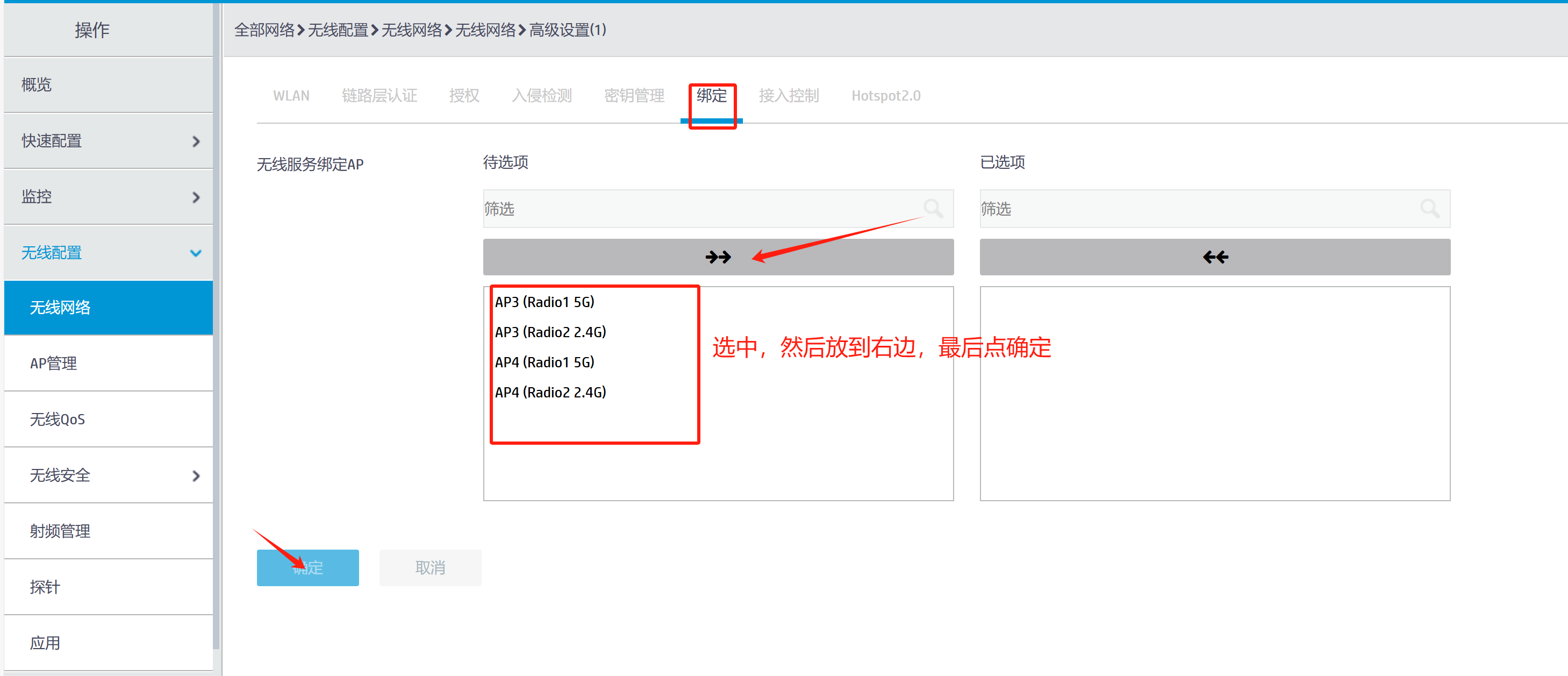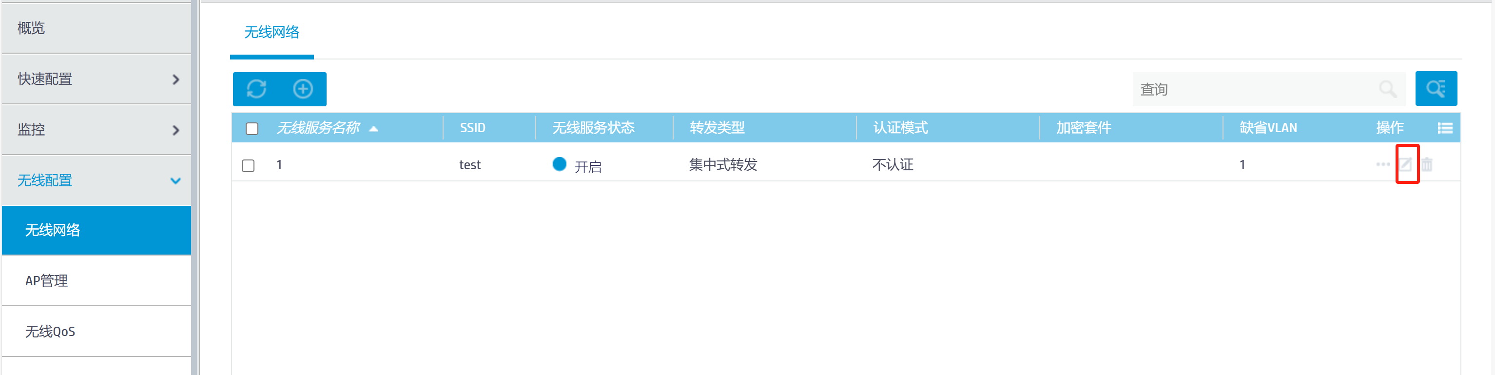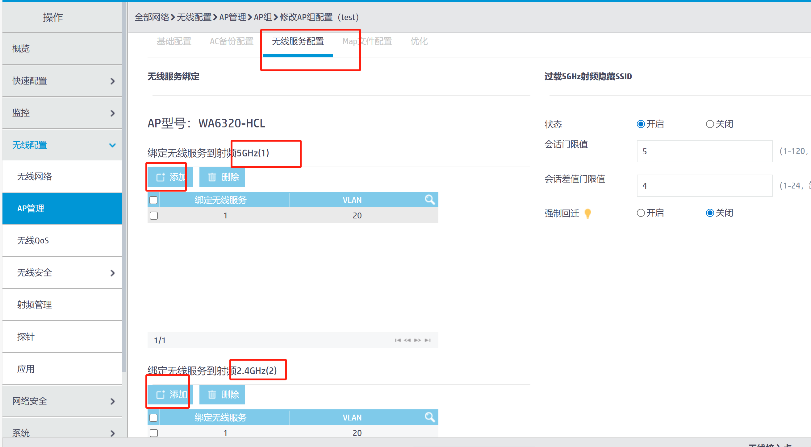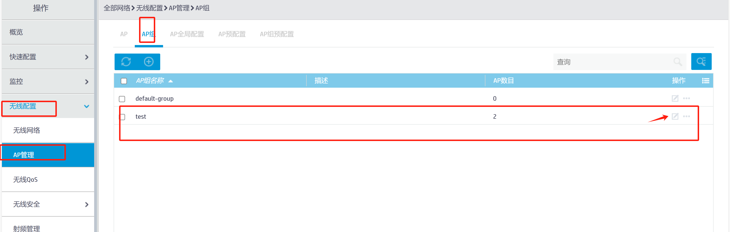 老师好:无线AC网页版上,配置了AP组1(里面包含WT和30个AP)和无线网络(SSID和密码都配置好),如何让AP发射的无线网络和AP组1关联?没找到地方,还请教指导下。