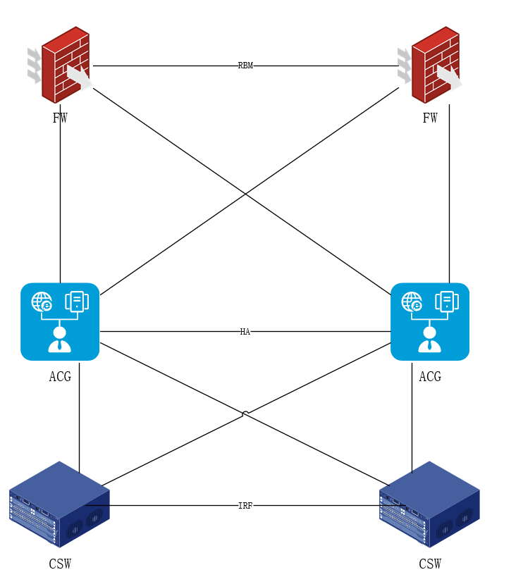 用户 → 核心交换机(IRF堆叠) → 防火墙(主备热备) → 上网行为管理(主备热备) → 出口路由器