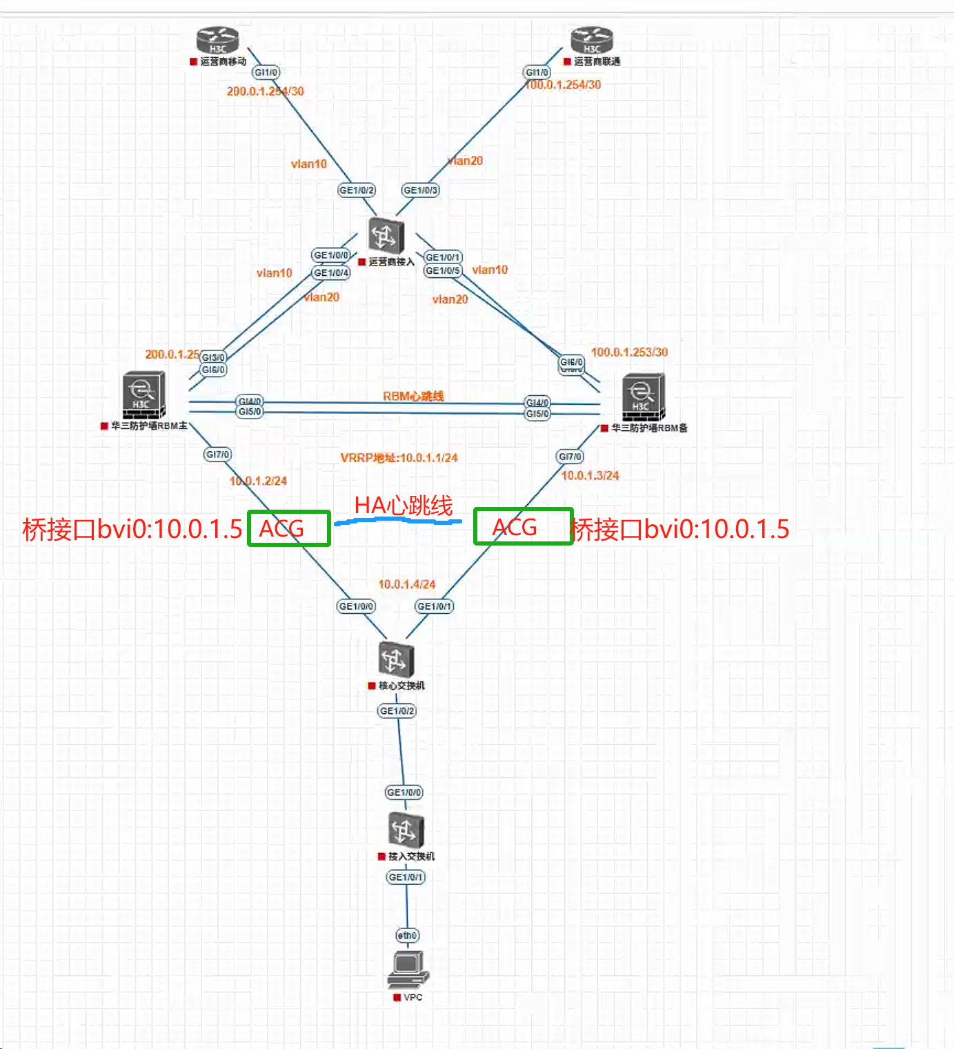 核心和防火墙做三层路由,ACG二层部署,ACG可以双主
