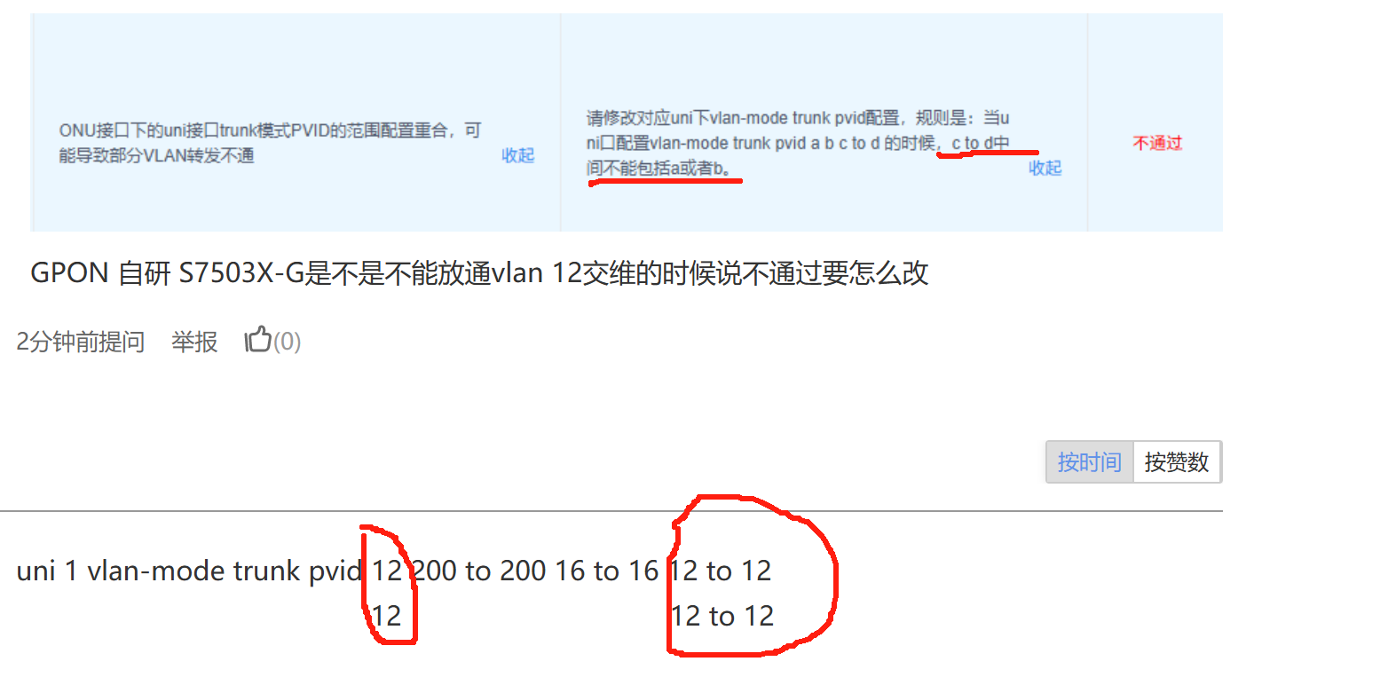 uni 1 vlan-mode trunk pvid 12 200 to 200 16 to 16 12 to 121212 to 12(即 VLAN 12),这直接包含了 PVID 的值12,违反了 “范围不能包含 PVID” 的规则,导致配置不通过。12 to 12部分,修改后的配置为:uni 1 vlan-mode trunk pvid 12 200 to 200 16 to 16(0)