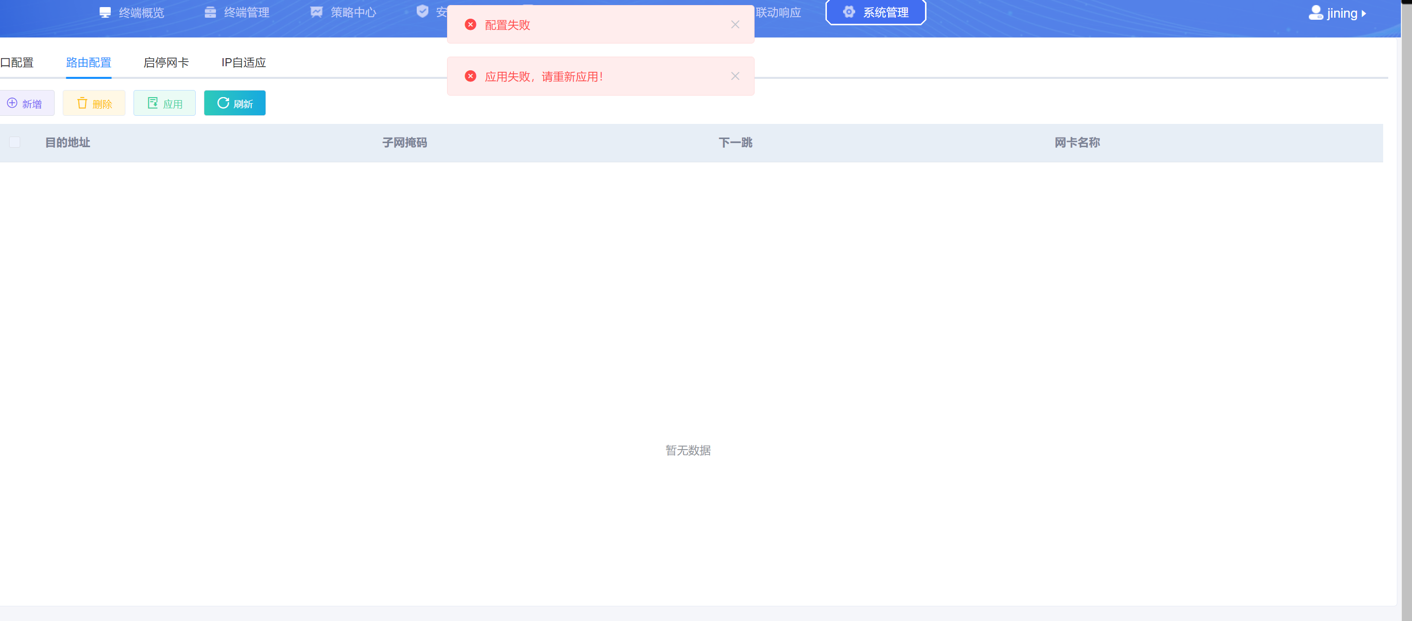 默认路由(0.0.0.0的目标网络)的网关请勿在路由配置项添加,“默认网关”项填写默认网关即可。