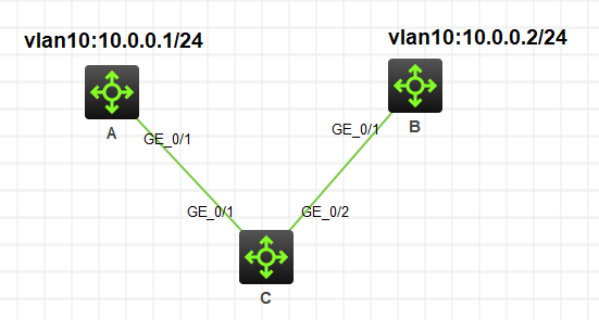 1,把 A 的1/0/1 B 的1/0/1和 C的1/0/1 、1/0/2都设置为trunk口并且放行了vlan10 ,然后其它端口都加入vlan 10,