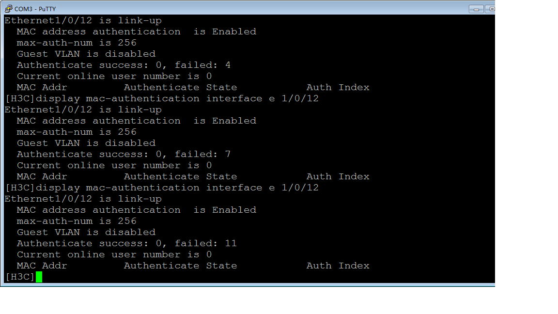 在该交换机以太网接口1/0/12接口连接一台PC,并开启MAC地址认证。