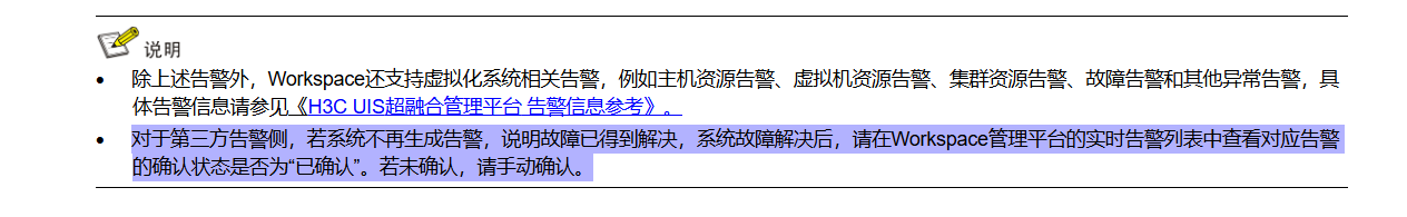 “对于第三方告警侧,若系统不再生成告警,说明故障已得到解决,系统故障解决后,请在Workspace管理平台的实时告警列表中查看对应告警的确认状态是否为‘已确认’。若未确认,请手动确认。”