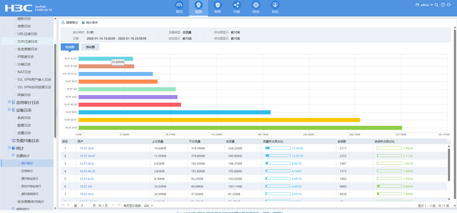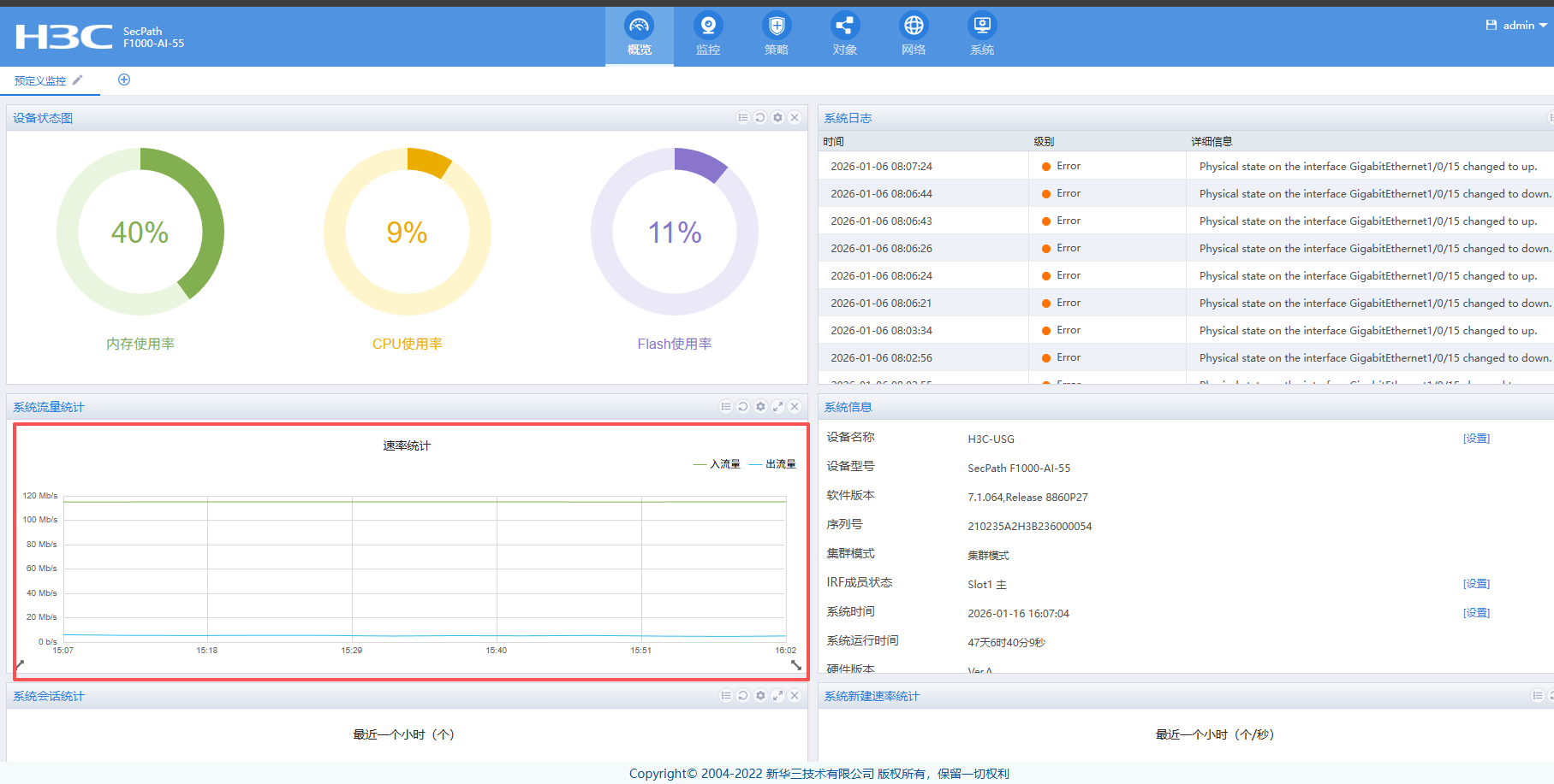 针对F1000-AI-55防火墙显示宽带出口流量占满的情况,可通过以下步骤快速定位流量源头: