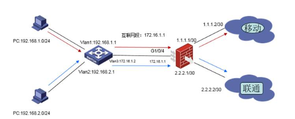 防火墙作为网络出口设备,外网有移动和联通两条线路。内网有192.168.1.0和192.168.2.0两个网段,需要实现192.168.1.0网段走移动线路,192.168.2.0网段走联通线路。当两条线路中的一条线路故障时数据可以通过正常链路转发。