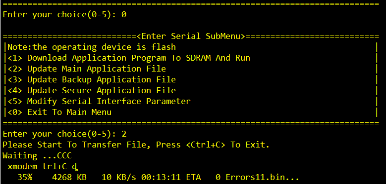 2,看看设备剩余空间多少?是不是没有足够的剩余空间了,如设备里没有你的上传文件,或者大小和本地保存的不一样,按0 返回主菜单,然后按 ctrl+F 将设备格式化后再上传,上传完后,再在主界面选择4 看看是否上传成功,最后确定上传成功了,将上传的文件设置成主启动文件,然后重启即可
