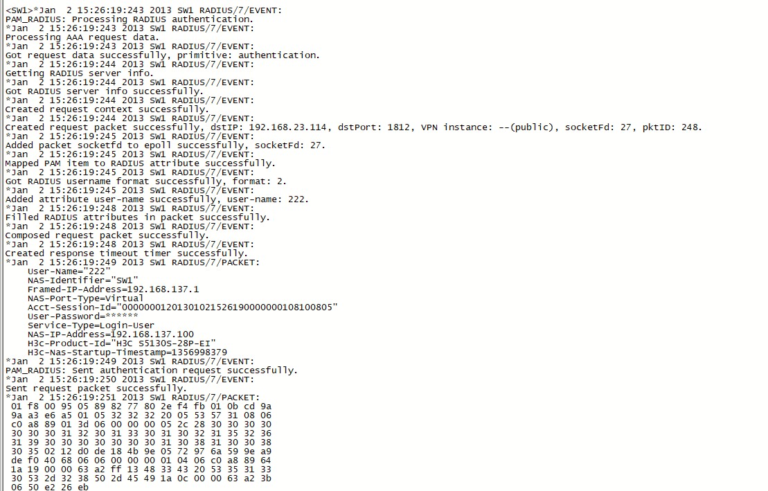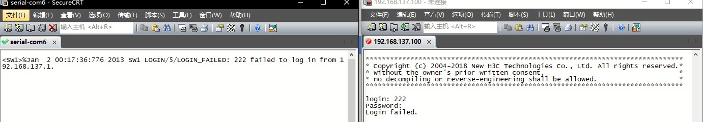 %Jan 2 00:15:49:094 2013 SW1 LOGIN/5/LOGIN_FAILED: 222 failed to log in from 192.168.137.1.
