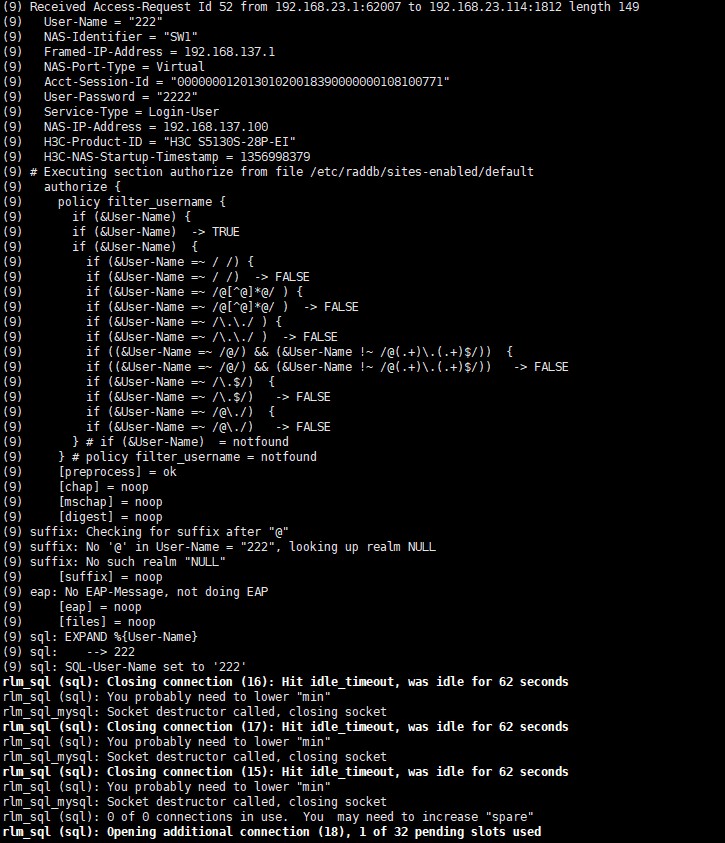 以下为radius调试模式下的输出信息。
