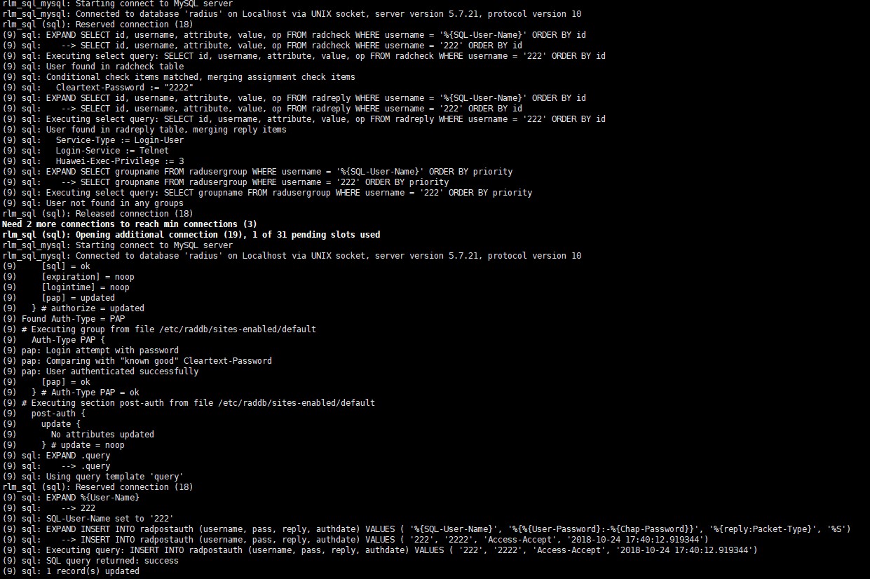 由于调试模式输出太多,所以在这里只显示Access-Accept消息。