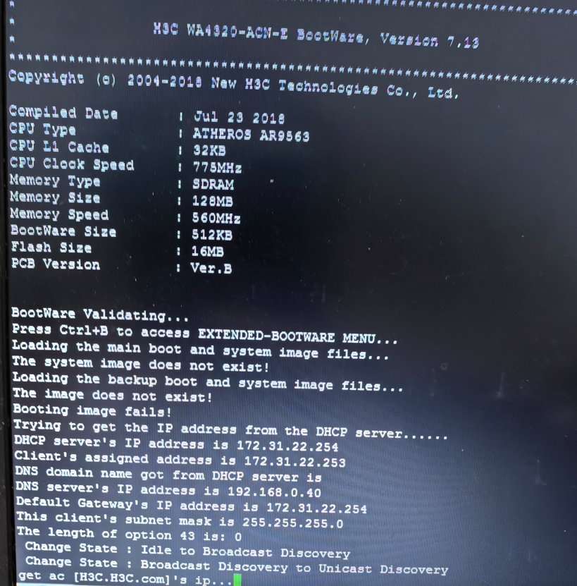 组网有AC的,但是AC发现不了AP,其他的AP都没问题,看了交换机端口的配置也都一样的,我好奇的是启动没找到镜像,这个和同型号的AP启动画面不一样。