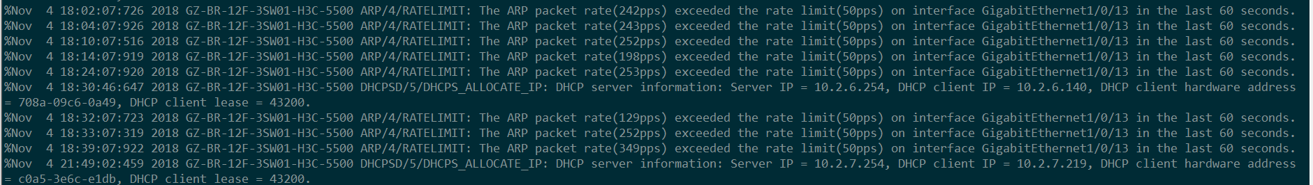 看日志是arp超限速了,arp上送CPU处理的时候为了防止上送的太多,会有一个限定的值,如从日志看,应该是50pps,这个可以通过命令调大一些,现场交换机display version看一下具体设备型号以及版本