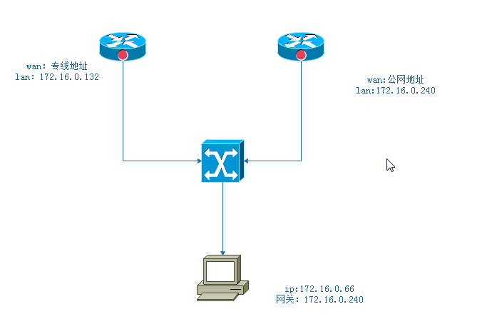 先有两台路由器,一台接外网,另一台接专线网,怎么配置使得PC机网关为外网路由并且即通外网又通专线网。