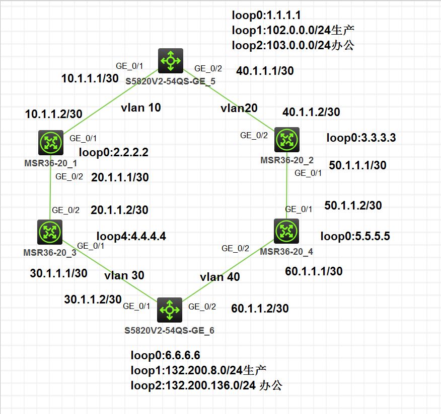 1.要求上面交换机访问下面交换机生产的走左侧链路,办公的走右侧链路?这个如何控制OSPF的选路?