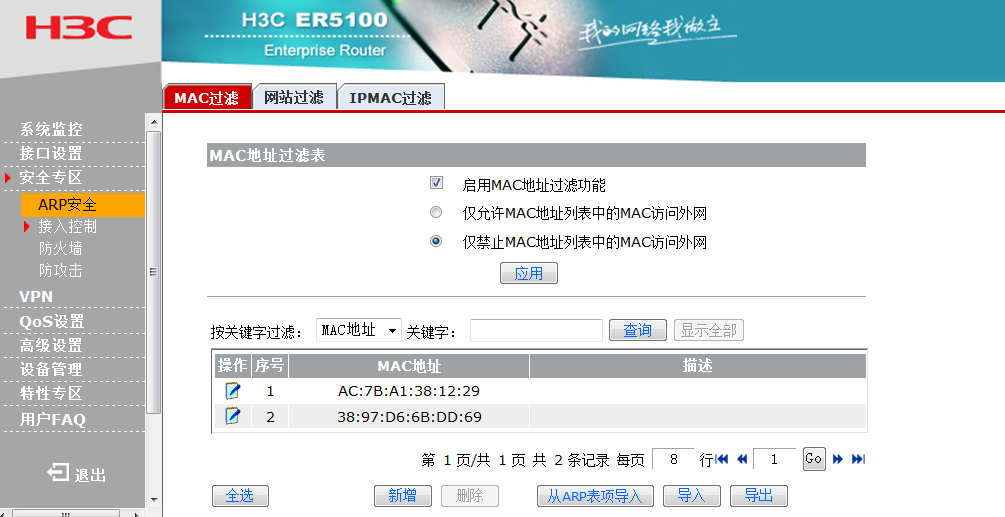 安全专区→接入控制→MAC 过滤