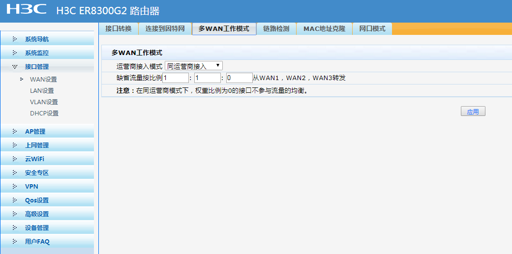 设备上共有3条外线连接WAN口,想实现流量只从WAN1、WAN2口走,缺省流量比例设置为1:1:0,但是从流量监控中,还是能看到有来自WAN3口的流量,请问这个问题该如果解决?谢谢!