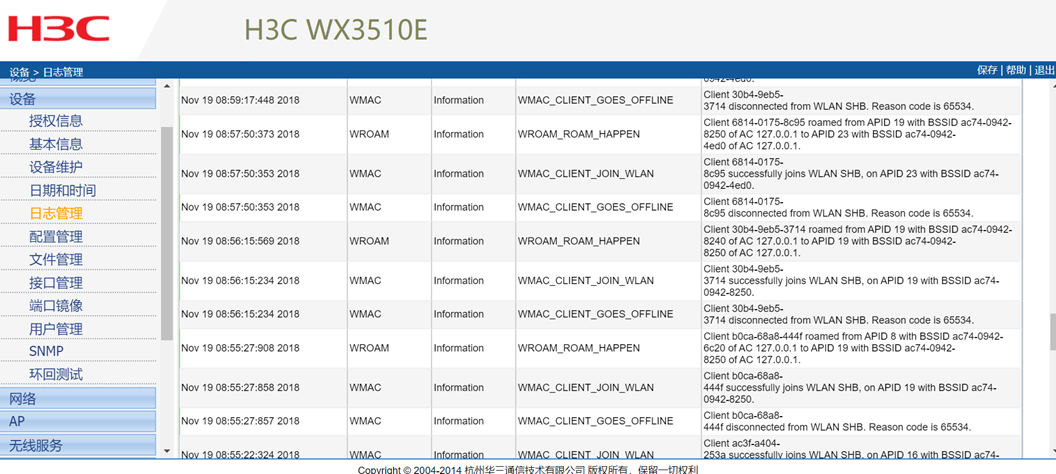 2个无线AC,型号都为:H3C WX3510E。故障:这几天发生2台AC交替无法通过WEB访问,也PING不通IP。但信号灯正常闪烁。查看日志工作又是正常工作的。不进行任何操作大概过10分钟至1个小时会自动恢复WEB访问。AC故障期间出现极少用户WIFI连接不上,连接一会马上掉线的状况