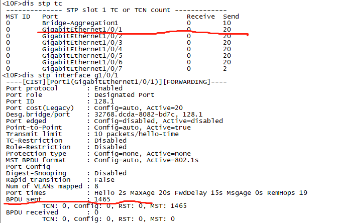 POE交换机下面端口UP/down,问题一:接口g1/0/1通过命令dis stp tc看到的是20, 但是在dis stp interface g1/0/1查看的是1465,为什么两者数值不一样?问题二:接口bridge-aggregation 1 通过 dis stp tc看到receive是0 ,但是通过 dis stp interface bridge-aggregation 1看到的是1561,为什么两者的数值不一样,求大神指导