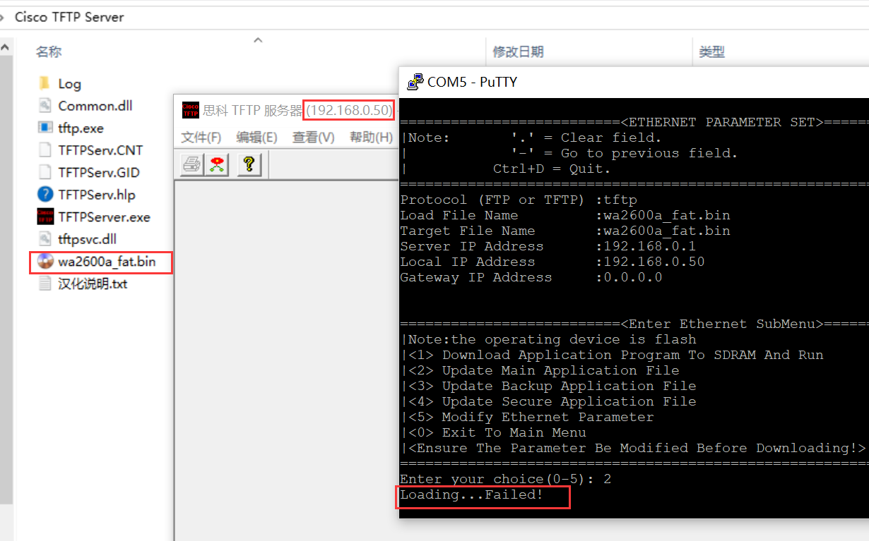 Local IP Address :192.168.0.50 (将连接的电脑地址设置成192.168.0.50,并启动tftp软件,将下载的版本文件该名成wa2600a_fat.bin,并放在tftp的根目录下)