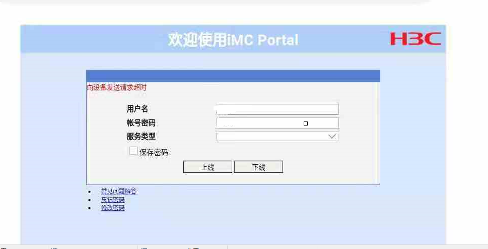设备之前portal认证都是可以实现的,IMC上和AC上的配置都没有改动过,但今天突然出现在portal页面输入账号密码后无法进入,出现向设备发送请求超时的告警,如图所示,用户名和账号我暂时抹去了