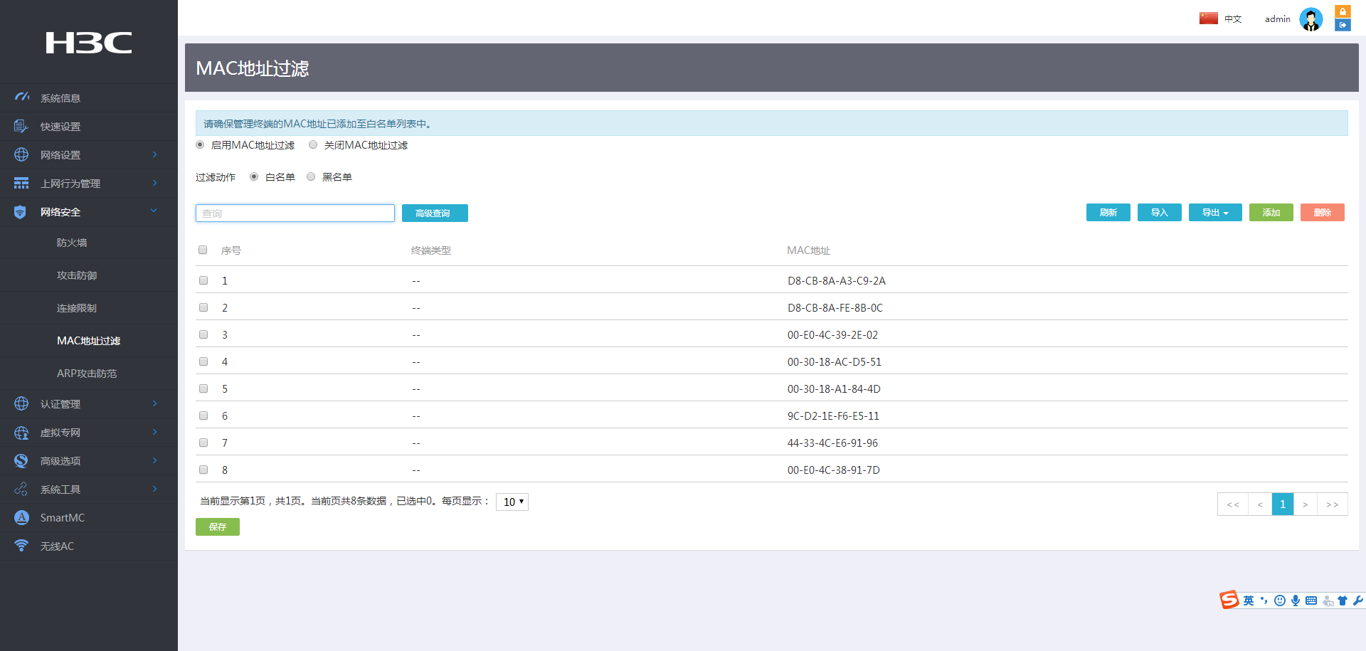 1、开启白名单以后,无效果。其他终端还是可以上网。
