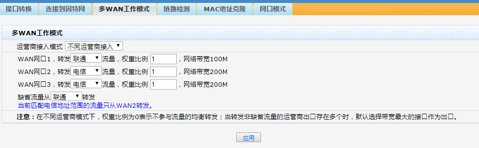 设置完均衡模式,为什么匹配电信地址的流量直冲wan2 转发,不是应该wan2 和wan3 均衡转发么?怎么设置才可以让wan2和wan3 同事启用呢?