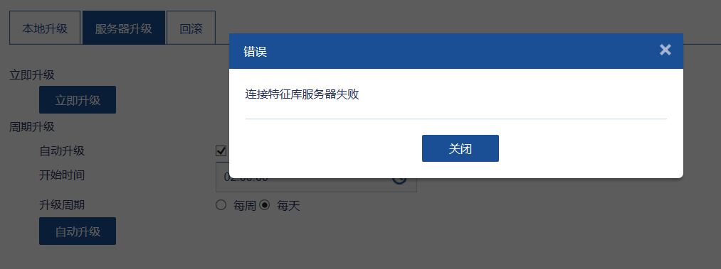 F100-A-G2防护墙+购买了AV、IPS、应用特征库已经成功导入,提示升级失败