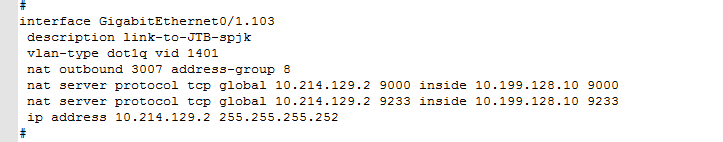本单位一台H3C U200防火墙,新起了一个子接口g0/1.103 配置IP地址10.214.129.2,对该接口做NAT映射,内部的一台服务器10.199.128.10映射到10.214.129.2,但是外部始终无法通过该出口地址访问内部服务器,同时在内网口G0/0做了回环NAT,但内部地址也无法通过外网地址访问内部服务器10.199.128.10